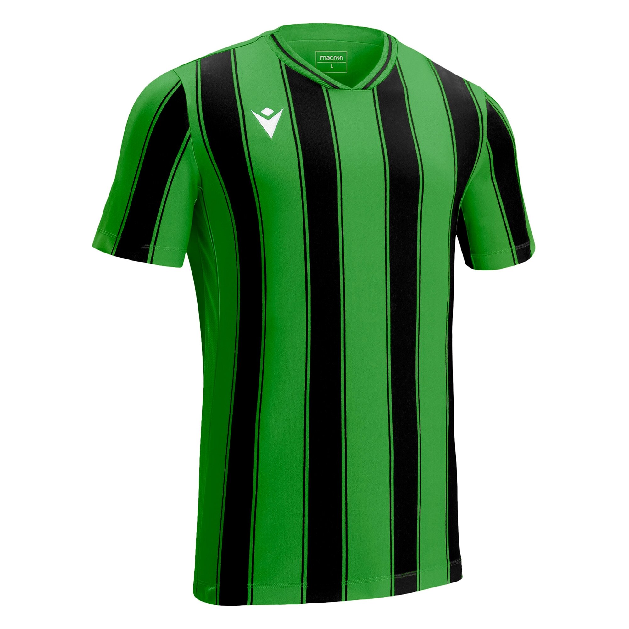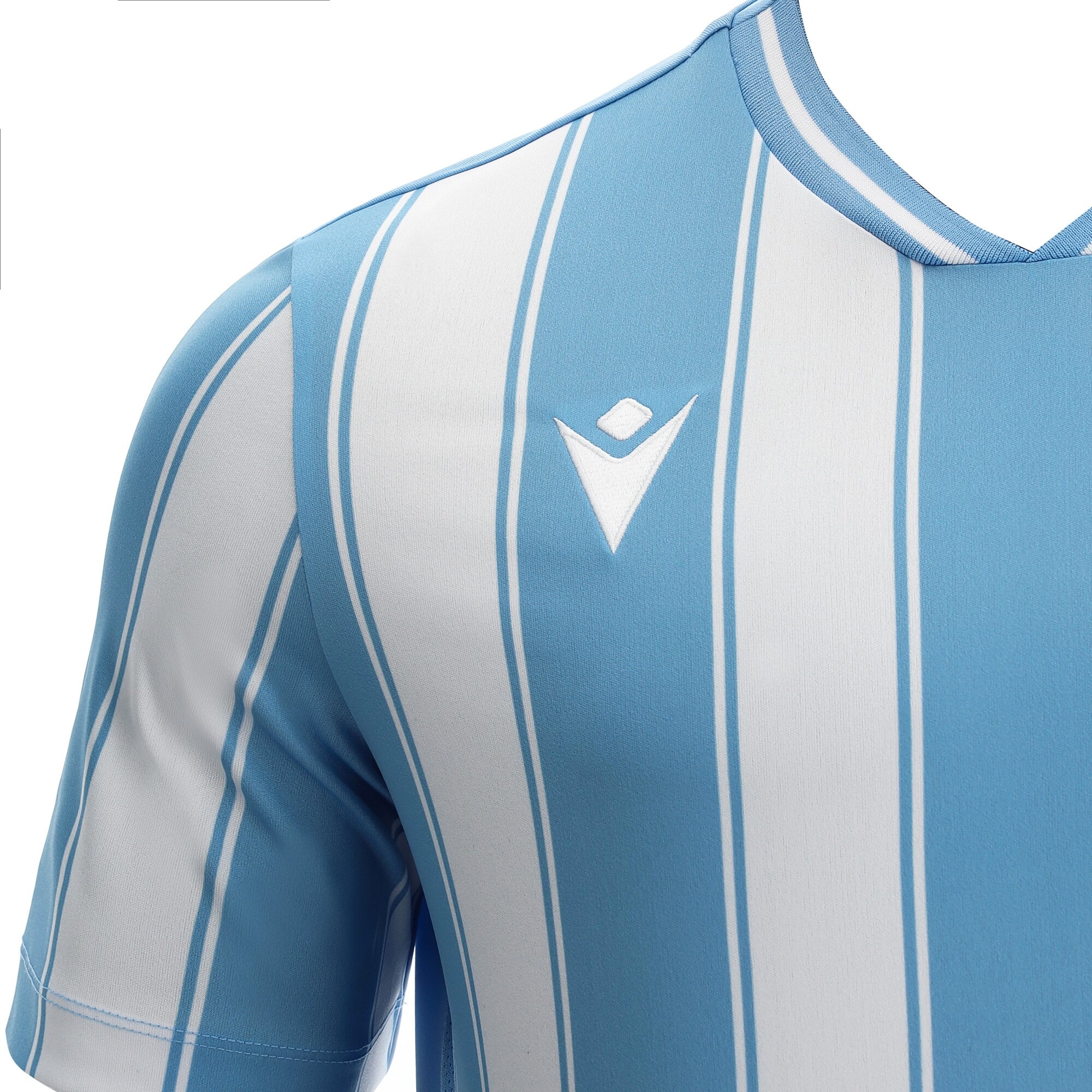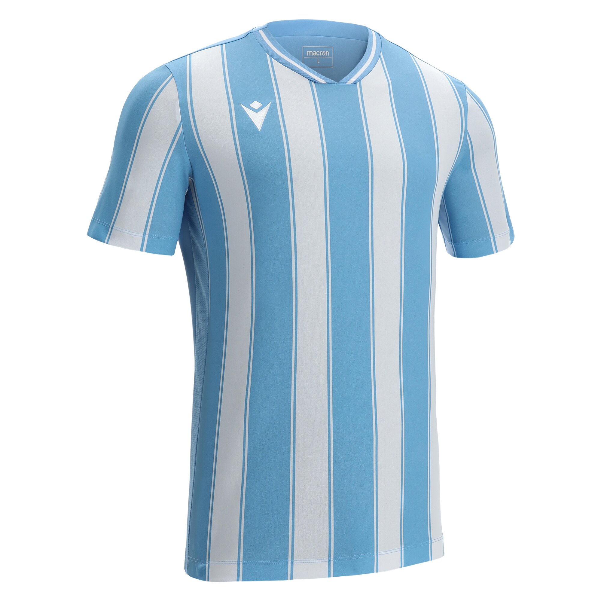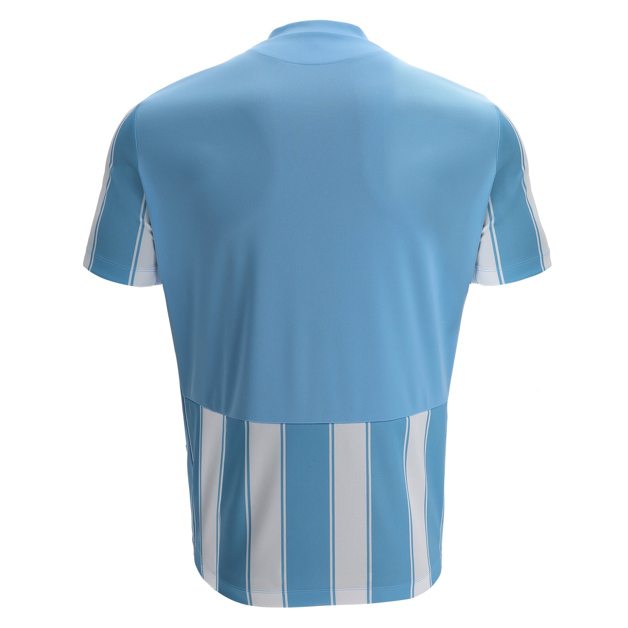 Fußballtrikot aus 100 % Polyester-Interlockgewebe. V-Ausschnitt aus Strick und Hinterkragen aus Hauptstoff. Mesh-Seiteneinsätze für Atmungsaktivität und Tragekomfort. Streifenmuster hinten mit Aussparung für die Rückennummer.